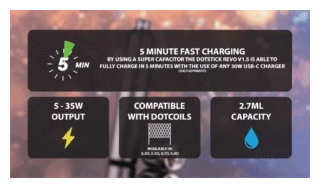 - 兼容所有0.3Ω或更高的dotCoils(dotAIO V2和dotTank 25mm)
